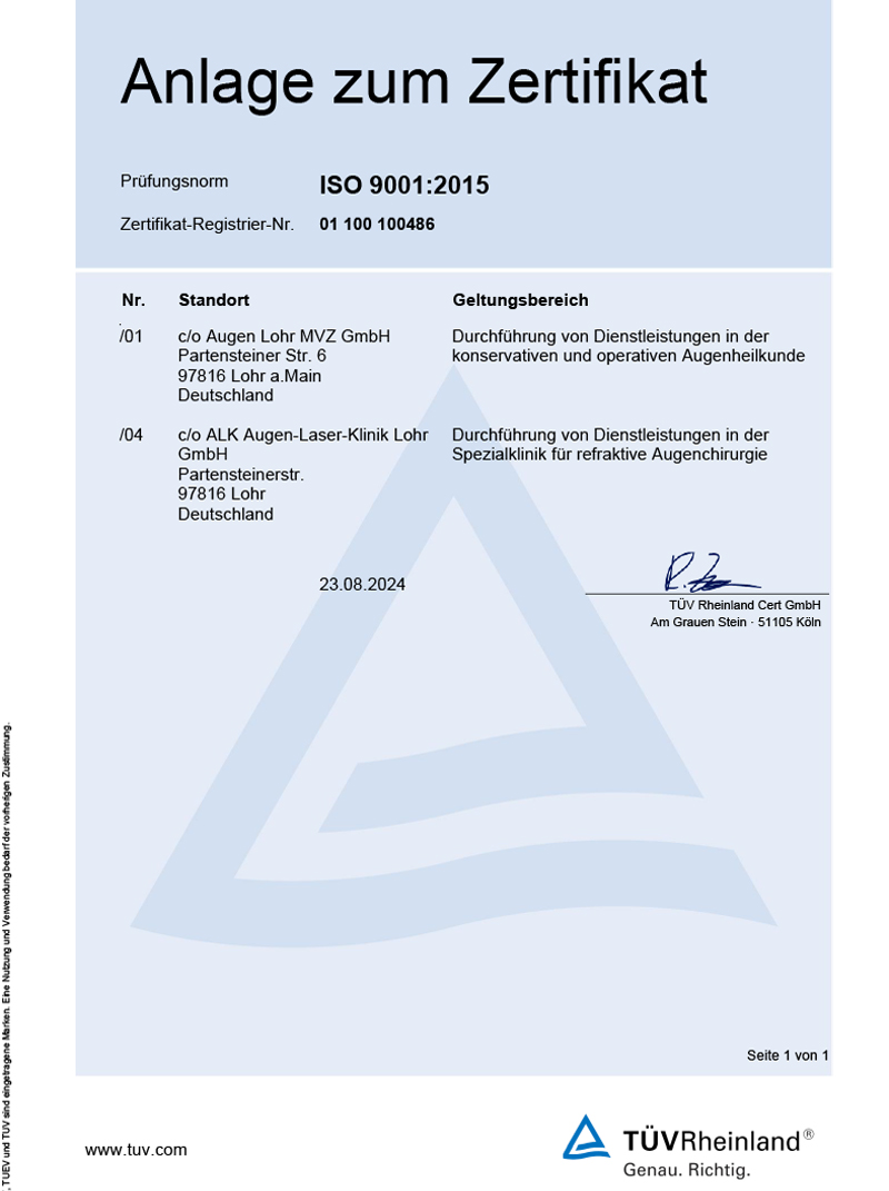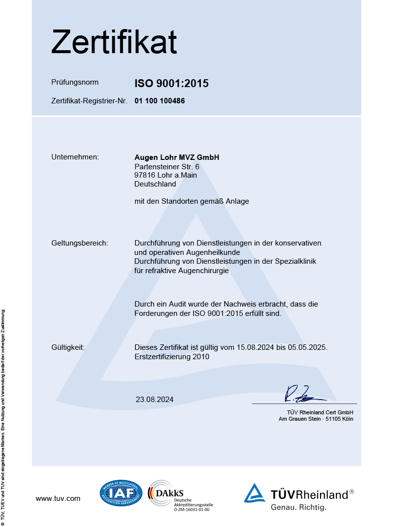 Das AUGEN LOHR MVZ sowie die Augen-Laser-Klinik Lohr sind nach DIN ISO 9001 : 2015 durch den TÜV Rheinland zertifiziert.